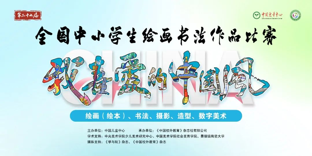 全國中小學(xué)生繪畫書法作品比賽創(chuàng)辦于1995年,是經(jīng)教育部批準(zhǔn),中國兒童中心主辦,面向小學(xué)到高中 各年齡階段少年兒童的盛大美育活動。比賽項目包括繪畫、書法、攝影、...