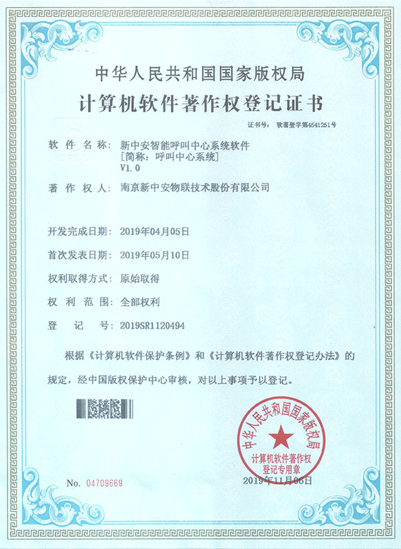 著作權(quán)人:南京新中安物聯(lián)技術(shù)股份有限公司 開發(fā)完成日期:2019年04月05日 首次發(fā)表日期:2019年05月10日 權(quán)利取得方式:原始取得 權(quán)利范圍:全部權(quán)利 登記號(hào):2019SR1120494
